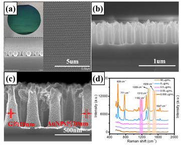 基于自组装技术晶圆级PS紧密排列单层膜掩模版的制备,使用微电子图形化转移技术,制备了硅纳米柱微纳结构,利用磁控溅射技术进行贵金属纳米粒子沉积制备硅纳米柱表面增强拉曼散射(SERS)基底。由于增强热点可作用区域表面积小,待测分子增强热点处状态对SERS增强具有影响。基于自组装技术大面积周期超小尺寸硅纳米柱结构的可控制备;基于微电子技术及化学自组装技术,高性能硅纳米柱SERS基底制备;基于SERS基底增强热点处表面浸润性调制实现了SERS增强检测。