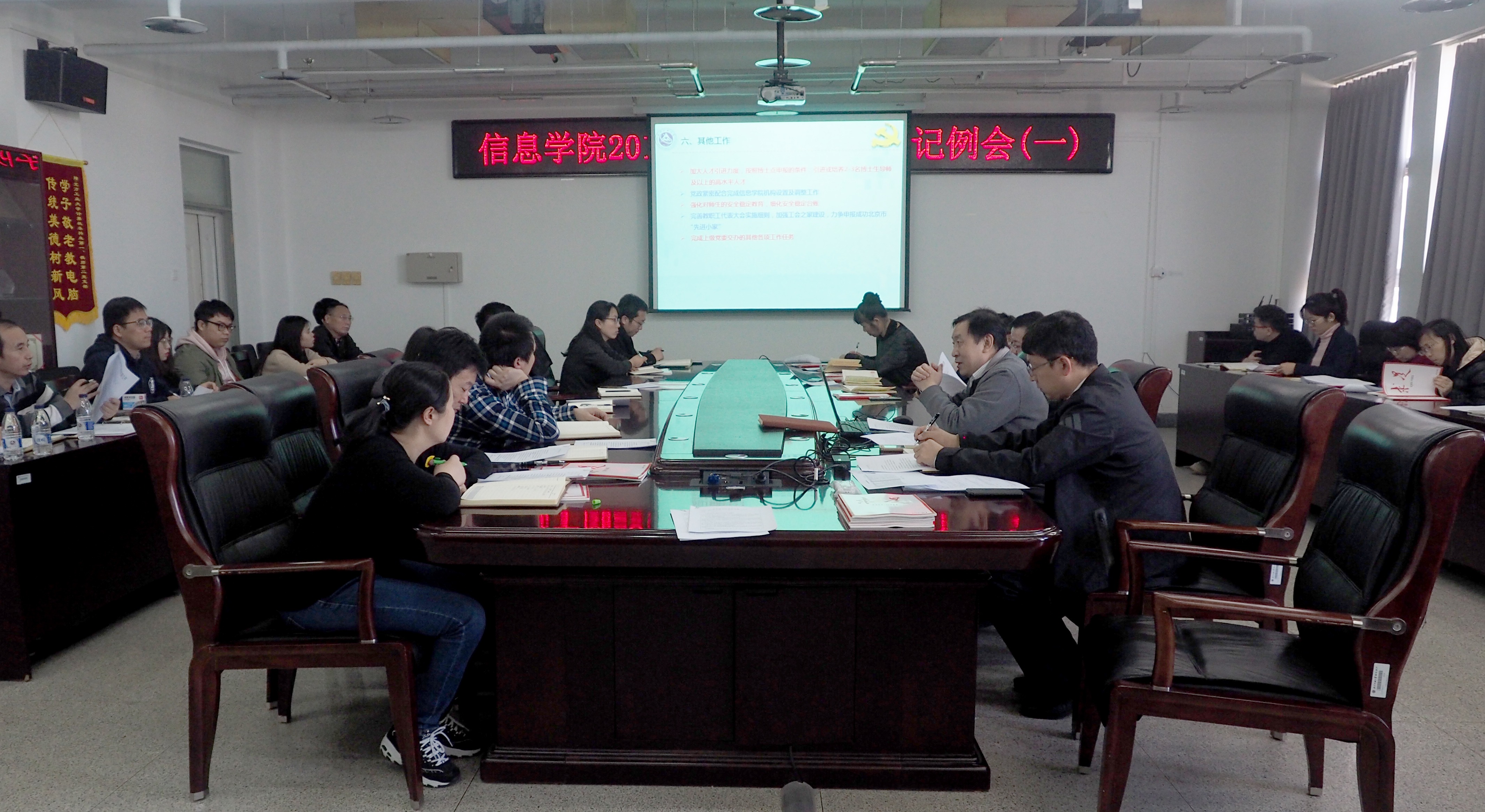 为贯彻落实学校2019年工作部署,明确学院党委新学期的工作要点,保证基层党建各项工作有序开展,3月5日,信息学院党委召开了2019年首次支部书记例会。党委办公室成员、各党支部书记参加,会议由学院党委书记刘文楷主持。