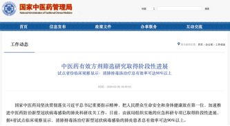 2020/02/06中医药有效方剂筛选研究取得阶段性进展,清肺排毒汤治疗新型冠状病毒感染的肺炎患者总有效率可达90%以上。
