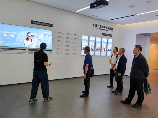 活动的第一部分是参观调研国家虚拟现实创新中心。与会人员详细了解了中心在虚拟现实技术研发、创新应用等方面的最新成果及发展规划。接着,严小天总经理介绍了国创中心的主要情况,强调了虚拟现实产业未来的巨大潜力和技术前沿。李晓波副总经理则分享了虚拟现实技术在各行业的应用前景,并展示了中心在推动虚拟现实产业创新方面的成就。随后,澳门pg官方电子平台智能学院的马礼书记代表学院介绍了在虚拟现实领域的教学和科研进展,展示了学院在数字媒体技术和虚拟现实技术融合方面的最新成果。